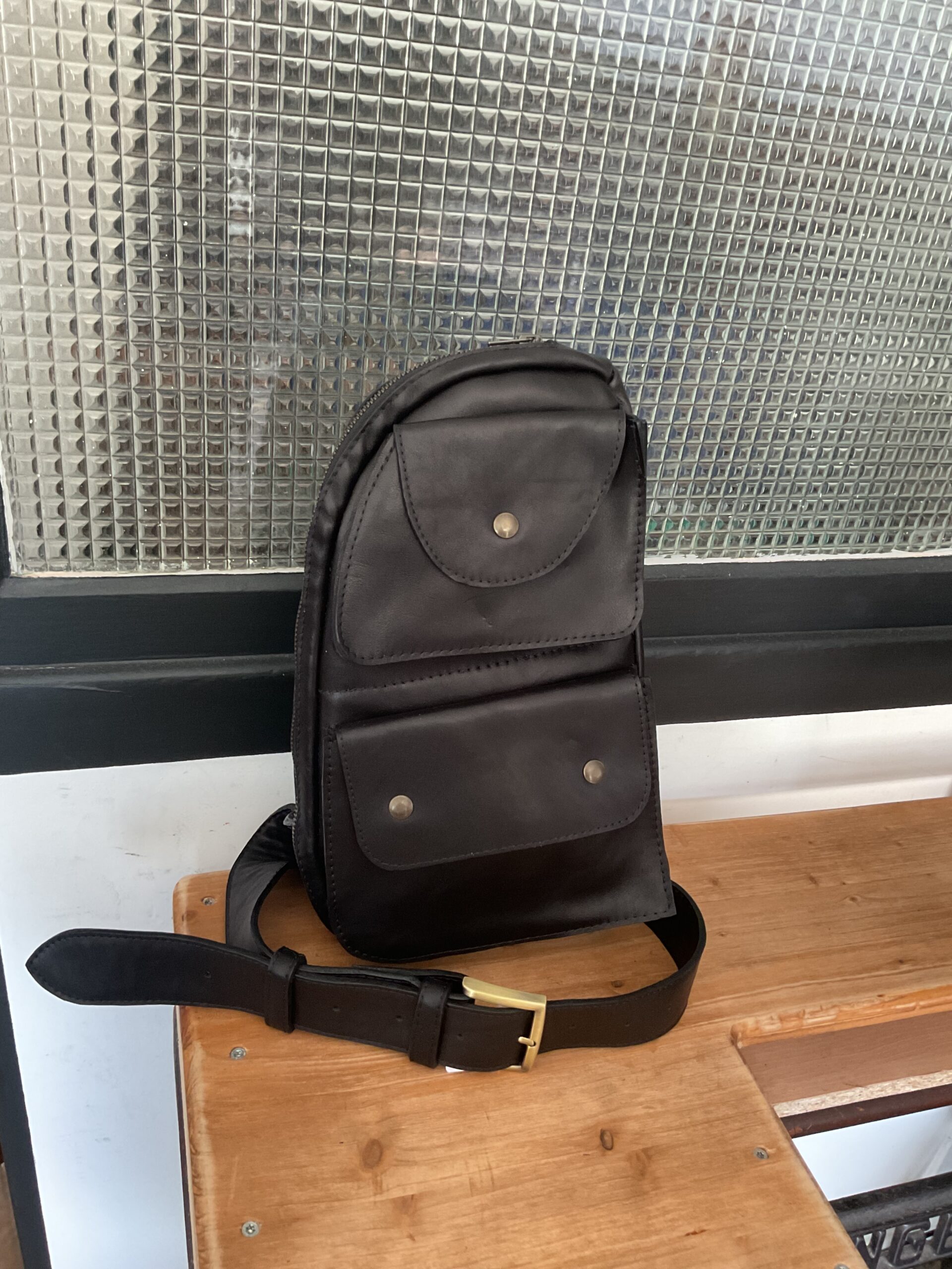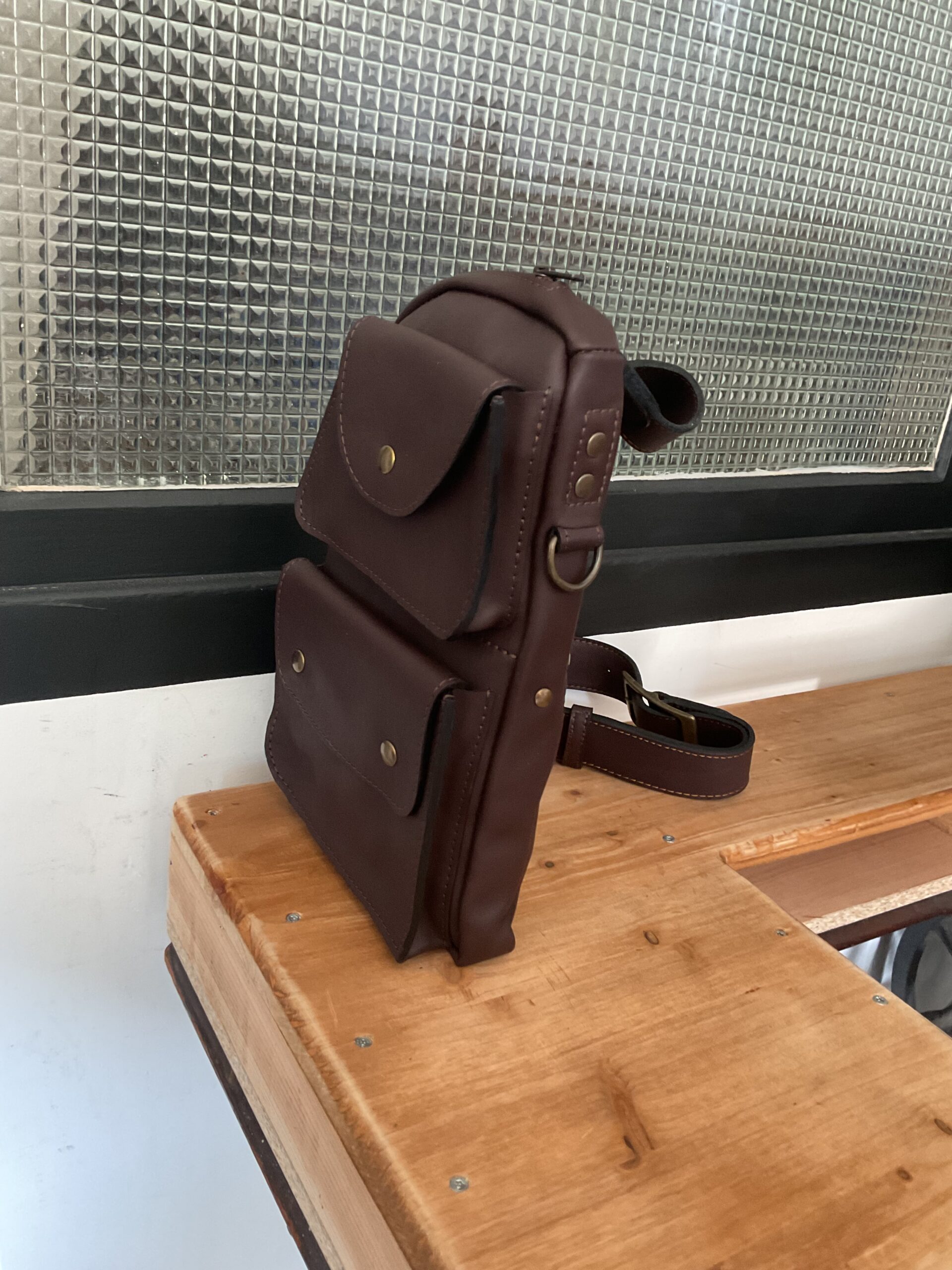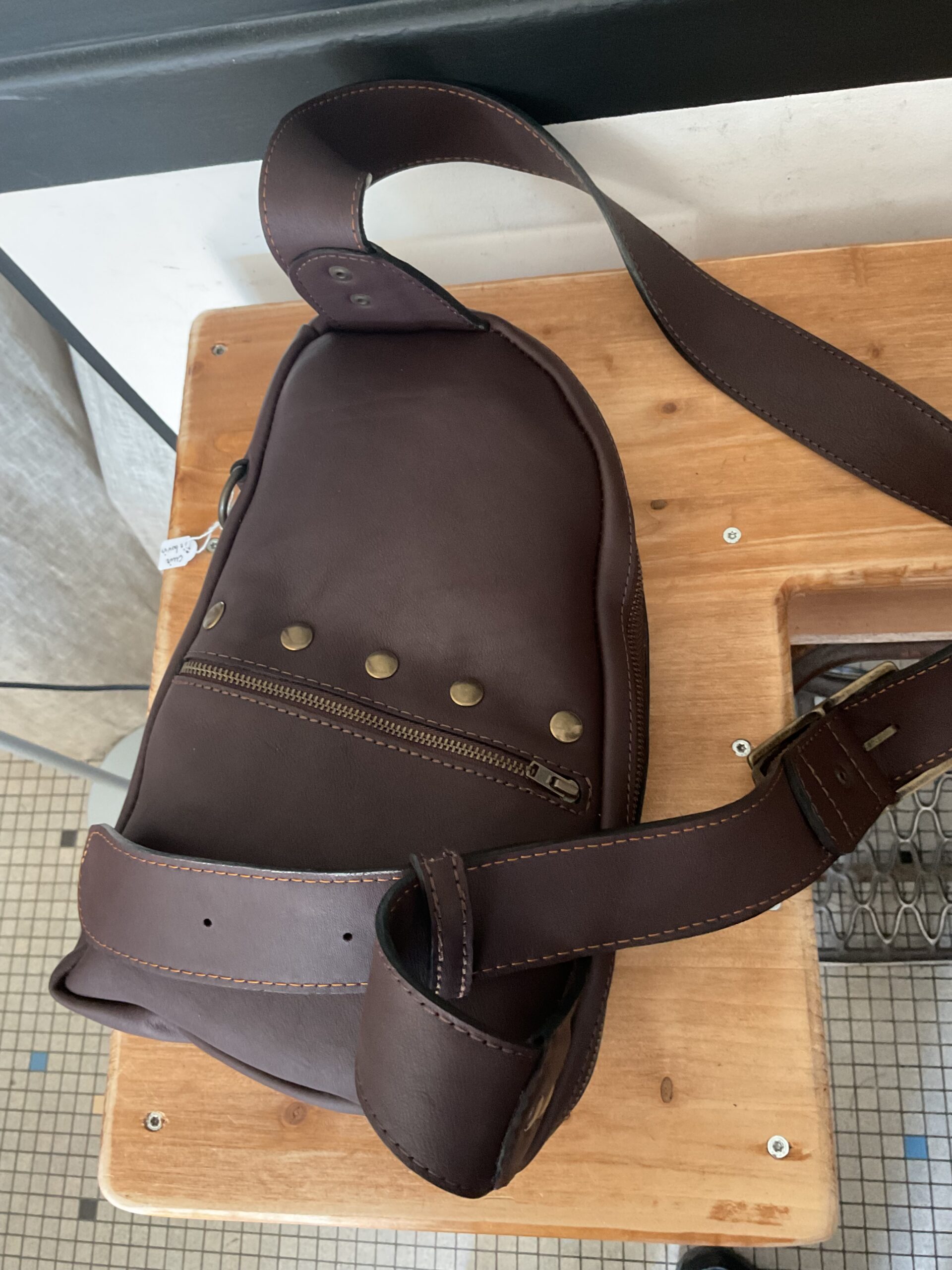 Sacoche « max » , en cuir de vachette, doublé croûte de cuir, une poche principale plus trois autres poches, bandoulière réglable. Taille du sac 20*30 cm environ.