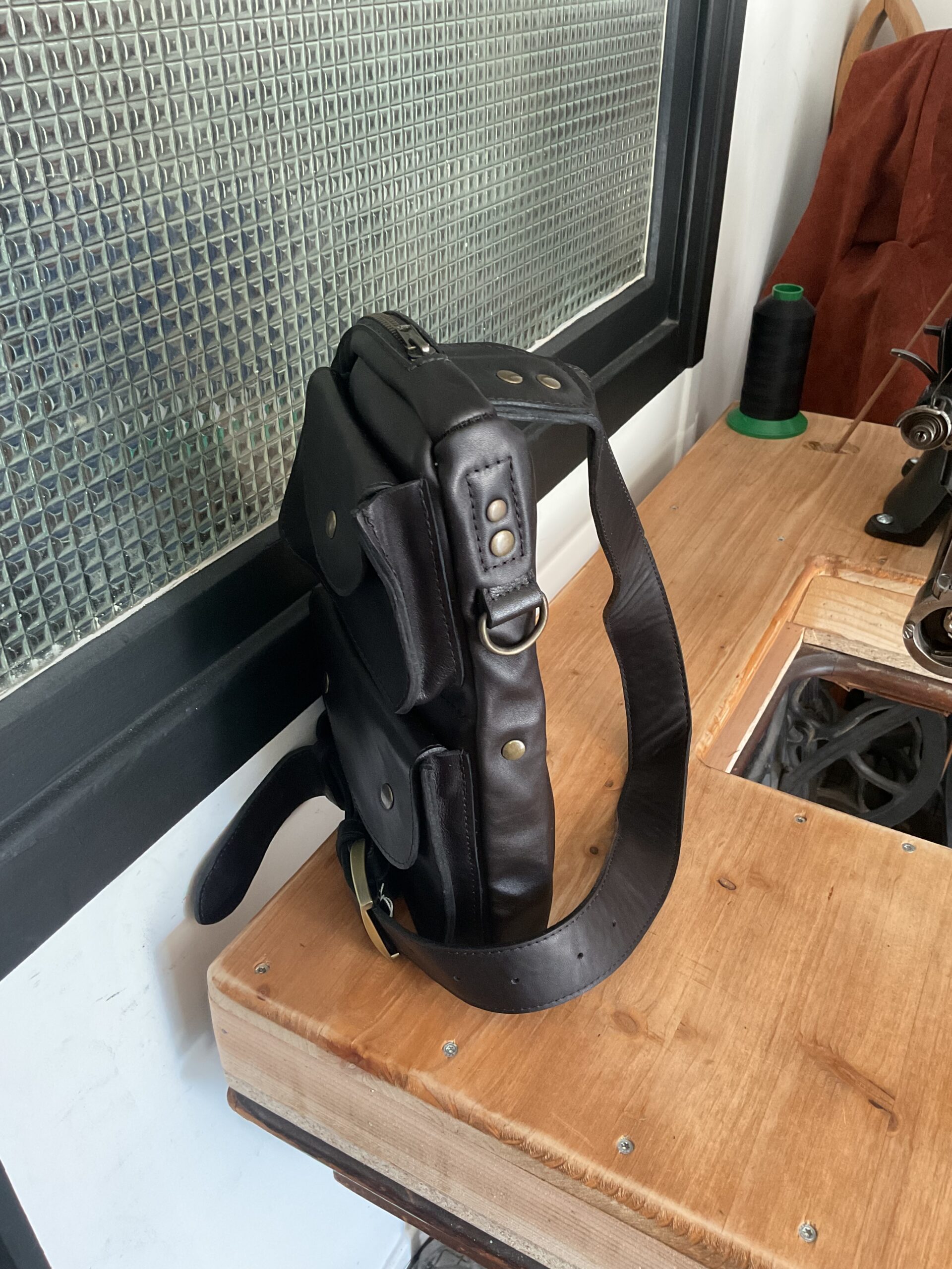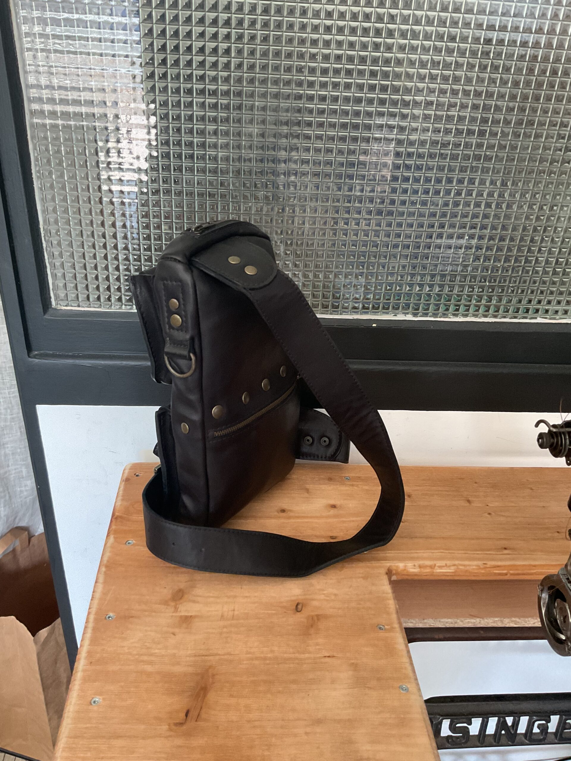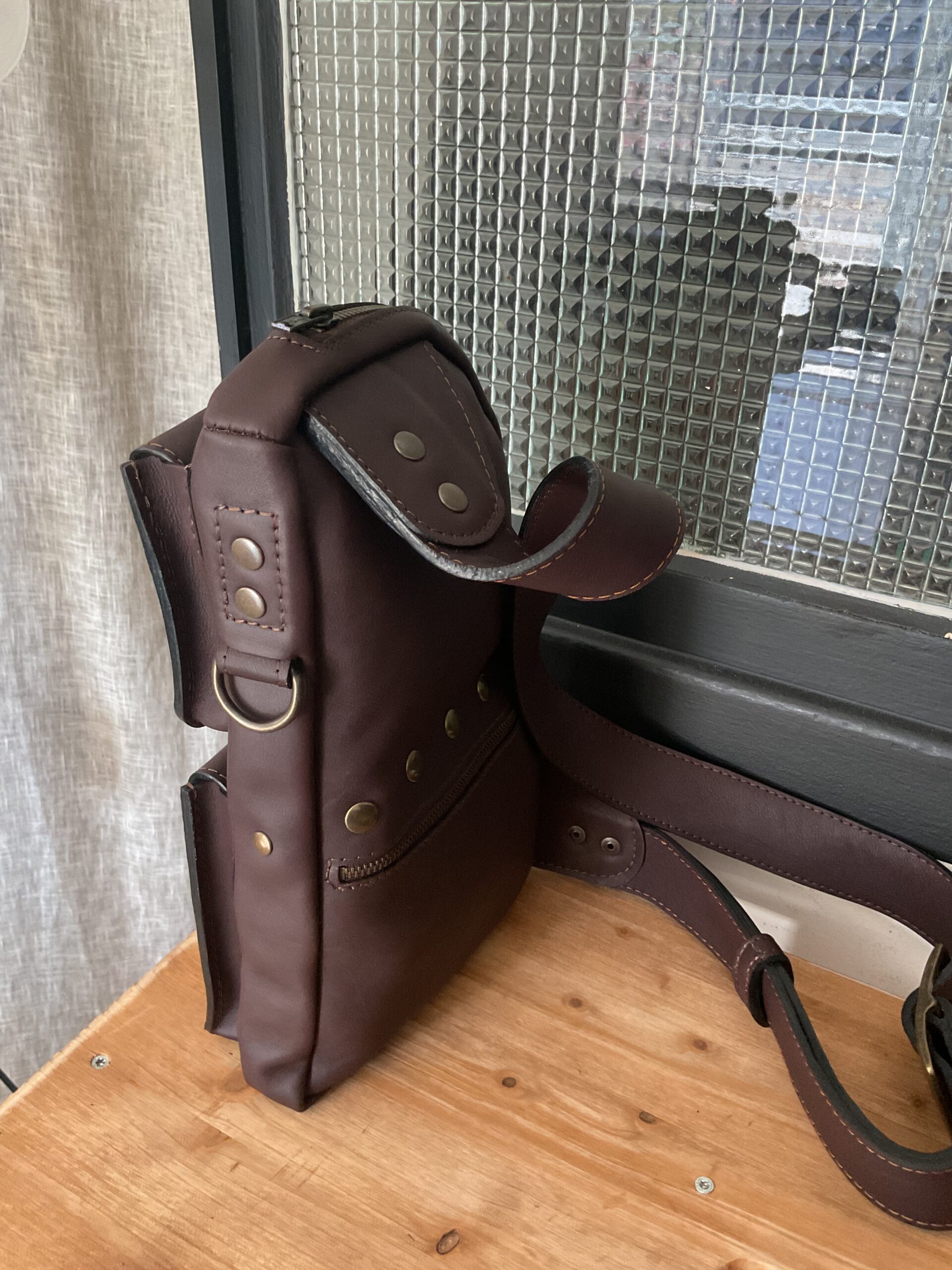 Sacoche « max » , en cuir de vachette, doublé croûte de cuir, une poche principale plus trois autres poches, bandoulière réglable. Taille du sac 20*30 cm environ.