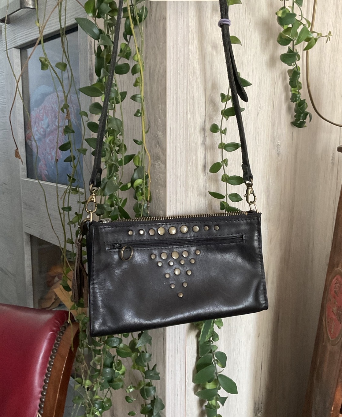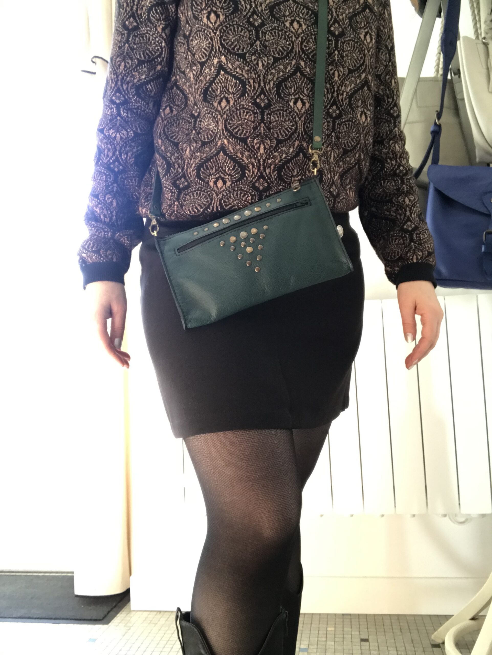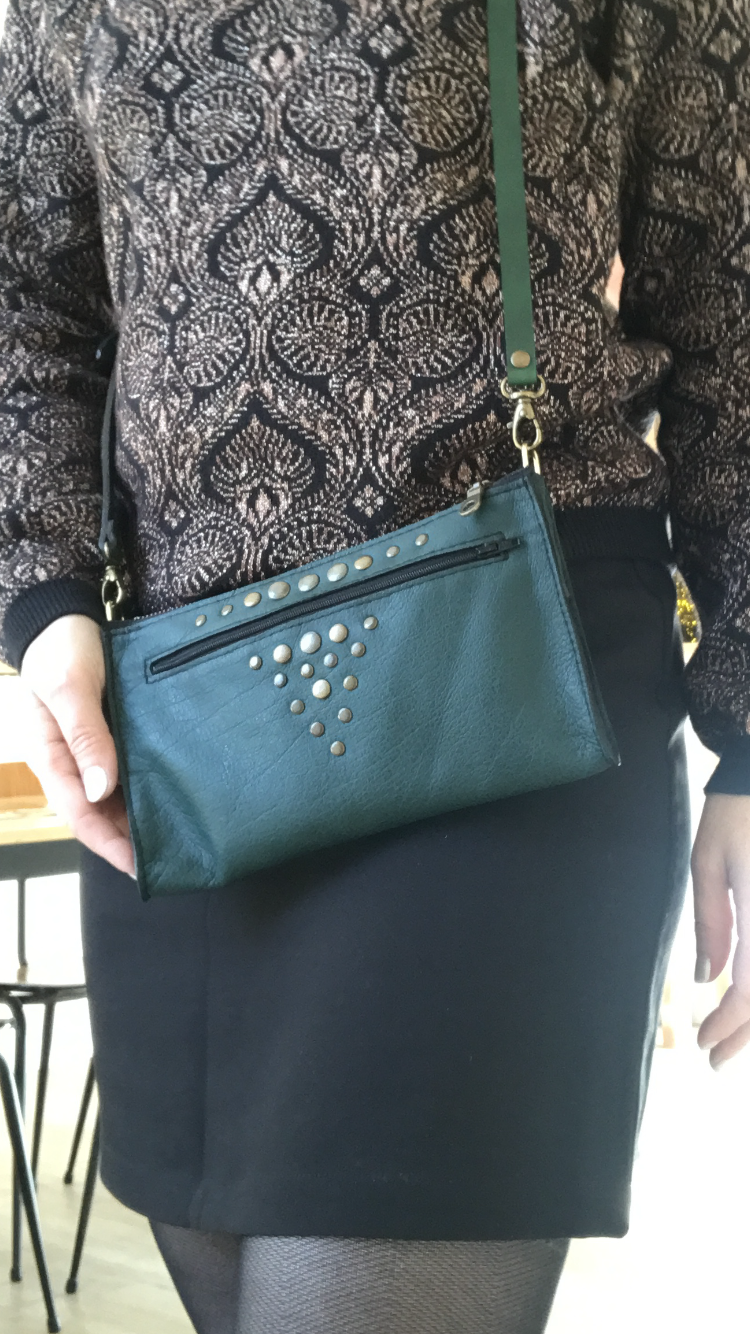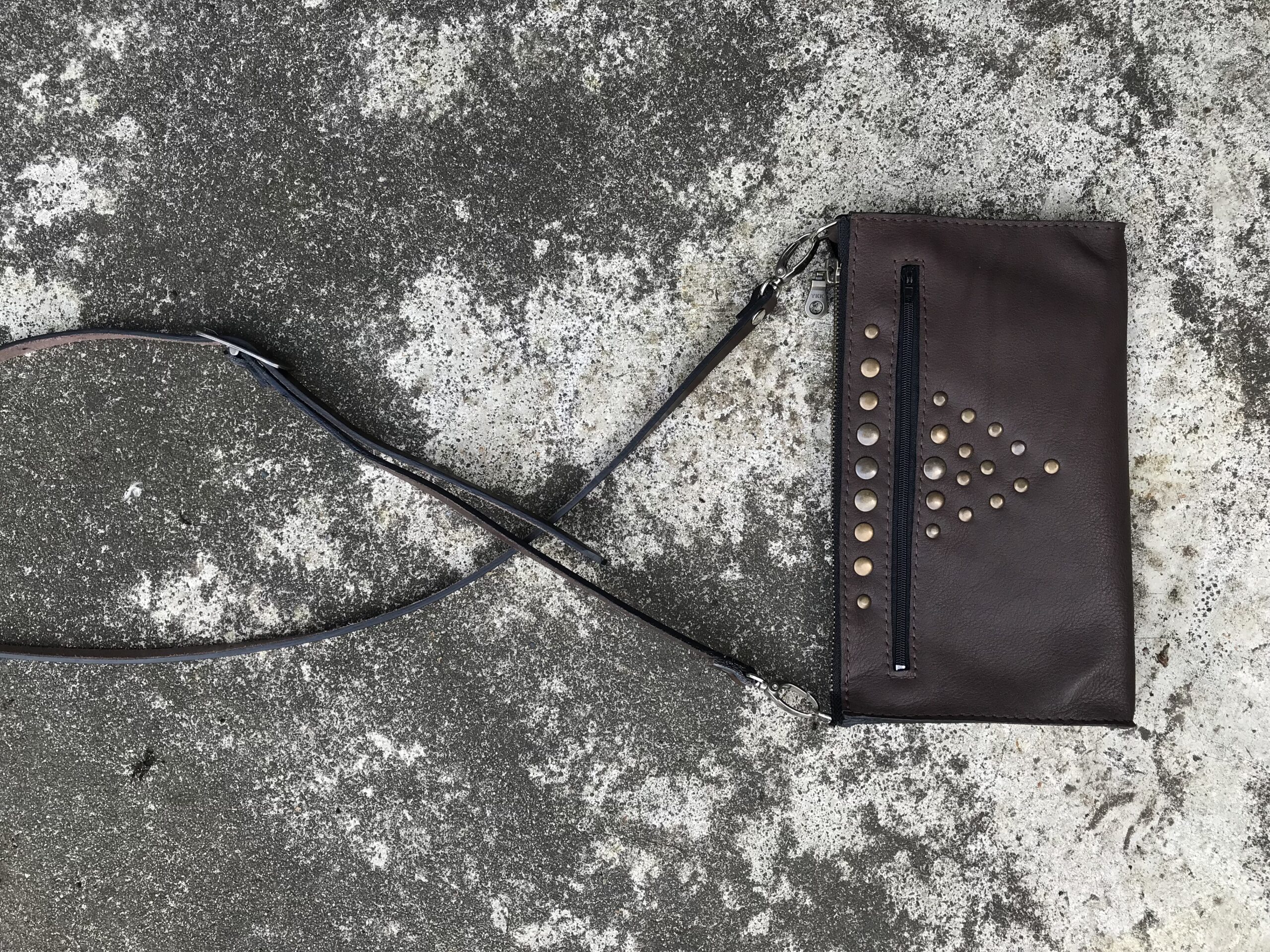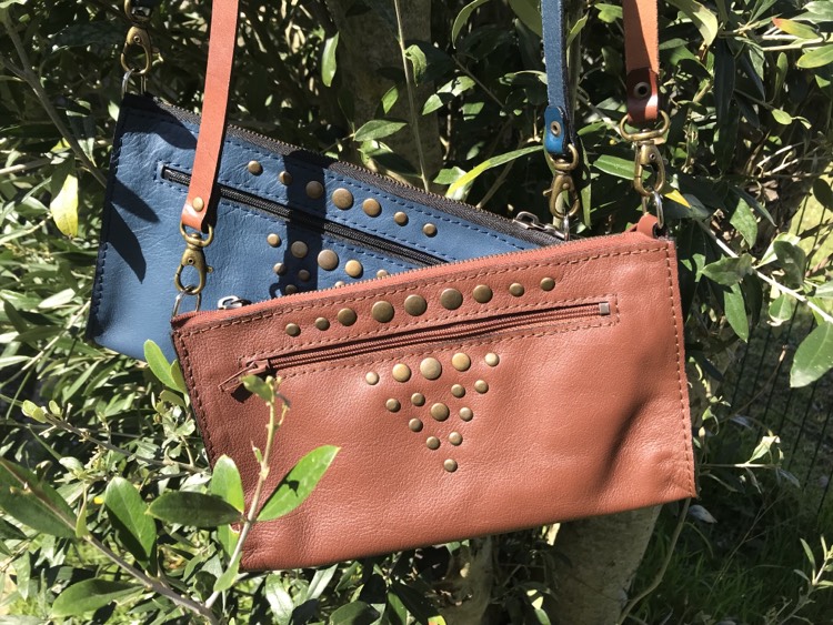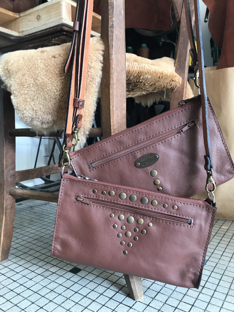 Pochette en cuir de bovin doublé croute de cuir avec deux poches, bandoulière réglable et amovible. Rivets décoratifs devant uniquement. 23 par 13 cm environ.